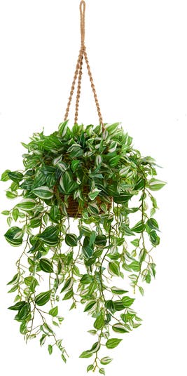 Fill bare spaces with natural greenery with the help of this artificial wandering Jew plant, flaunting variegated leaves with realistic characteristics that feel real to the touch. Reaching 35” long from its hanging basket, this overgrown silk plant is great for maximizing vertical space.