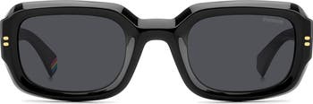 Beveled frames and signature accents create an elevated aesthetic on slim rectangular sunglasses fitted with glare-reducing polarized lenses.