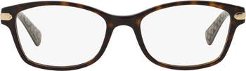 Goldtone hardware gleams at the temples of Italian-made optical glasses shaped in a sleek rectangular silhouette with crystal-clear demo lenses.