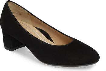 A gently rounded toe distinguishes a sophisticated and timeless leather pump fit with a cushy, arch-supporting footbed.