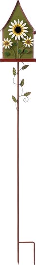 Add cheerful charm to your garden with this metal birdhouse featuring delicate daisy accents. The all-metal construction ensures durability while maintaining its vibrant color through sun and rain. With its convenient ground stake, you can easily place it anywhere in your flower beds or along walkways. This decorative piece creates an inviting nesting space for birds while serving as a lovely focal point in your outdoor space.