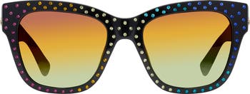 Sparkling crystal embellishments and signature eagle-head hardware elevate cat-eye sunglasses fitted with tinted UV-protective lenses.