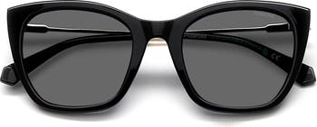 Polarized lenses mean color-true clarity in stylish cat-eye sunglasses stamped with laser-etched branding.