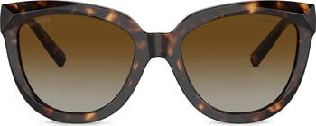 Sculpted logo hardware shines at the temples of Italian-made sunglasses featuring a suave cat-eye silhouette and glare-reducing polarized lenses.