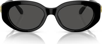 Full-cut crystals enchant the temples of these bold oval sunglasses fitted with tinted UV-protective dark-grey lenses.