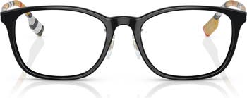 A signature Burberry design details the temples of rectangular optical glasses that make a smart, chic statement.