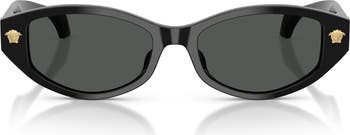 Medusa head logos illuminate the cat-eye frames on Italian-made sunglasses featuring subtle branding along the temples.