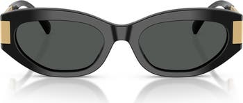 Greek key hardware gleams at the temples of stunning Italian-made sunglasses shaped in a slender cat-eye silhouette.
