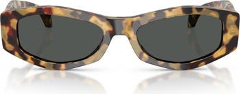A slim irregular profile and logo-accented temples distinguish Italian-made sunglasses shaped from lightweight acetate and fitted with smoky lenses.