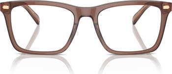 Signature monogram logos gleam from beneath the translucent temples of square glasses featuring a slightly contoured browline and lightweight acetate frames.