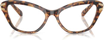 Goldtone and crystal-encrusted hardware strands crisscross at the temples of Italian-made glasses shaped in a retro cat-eye silhouette.