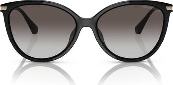 Engraved logos shine at the temples of these suave full-coverage sunglasses in a rounded cat-eye silhouette.