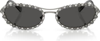 A stream of bezel-set crystals and half faux pearls runs along the frames and temples of these oval sunglasses with adjustable nose pads for easy wear.