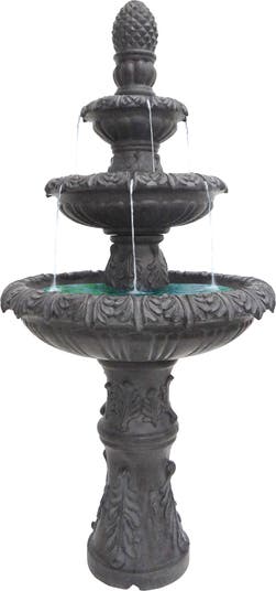 Bring the beauty of nature to your outdoor space with our stunning three-tier outdoor garden fountain. This fountain is a true statement piece that will add a touch of elegance and serenity to your garden or patio. With three tiers of cascading water, this fountain creates a soothing sound that will help you relax and unwind after a long day. Crafted from durable materials, this fountain is built to withstand the elements and will provide you with years of enjoyment. It will be the perfect addition to your outdoor oasis. Product Features: Three-tiered outdoor fountain Features an intricate leaf design and is accented with a pineapple finial Constantly recycles the same water Some assembly required Durable and weather resistant Pump kit included Use with a grounded 110V outlet Pump cord length is 7' Recommended for outdoor use Dimensions: 57" high x 27.25" diameter Material(s): polyresin