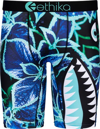 A toothy bomber jet dives down one leg of stretchy, kid-size boxer briefs covered in vibrant colors and patterns.