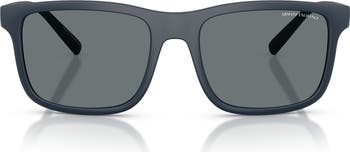 Subtle logo accents add a signature flourish to Brazilian-made glasses shaped in a rectangular profile with smoky lenses.