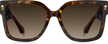 A golden flower and logo lettering shine on bold rectangular sunglasses featuring striking floral designs at the temples.