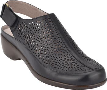 Floral perforations lighten the look and feel of a comfortable slingback clog with versatile appeal.