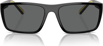 Sleek stripes race across the temples of sporty rectangular sunglasses finished with the iconic Ferrari logo.