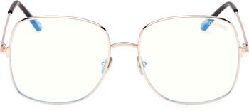 T-shaped motifs accent the square silhouette of Italian-made glasses fitted with lenses that help filter out blue light from devices and computer screens.