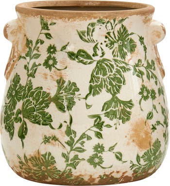 Arrange your faux-bulous flowers in this floral print vase (set of 1). The vintage ceramic planter has a homey feel with its palette of green flowers against a rugged backdrop. DIY and have fun mix-matching for a country chic look that delivers that fresh farm to home style. No drainage holes and indoor use only.