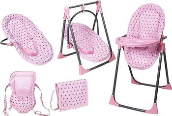 6-IN-1 CONVERTIBLE HIGHCHAIR PLAY SET: PINK - Elevate pretend play with the Lissi Baby Doll 6-in-1 Convertible Highchair Play Set, a versatile must-have for little caregivers. This multifunctional set easily transforms to meet your child’s nurturing needs, converting into a highchair, swing, bed, or carrier. For even more imaginative fun, it also includes a diaper bag and baby backpack, offering a complete care accessory bundle for on-the-go play. Designed in a sweet pink polka-dot pattern, this set adds a charming touch to any play space. It is compatible with dolls up to 18 inches (doll not included), making it a great addition to existing doll collections. Durable and lightweight, each piece is simple for kids to assemble and move, encouraging independence during play. Whether feeding their baby, rocking them to sleep, or taking them on pretend adventures, children will enjoy endless storytelling opportunities. Perfect for inspiring hours of creativity and role-play for children ages 3 years and up.