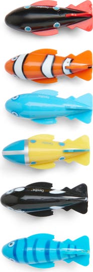 Add a splash of fun to your pool days with this pack of six colorful fishy torpedo dive toys.
