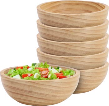 - Set: 6 Piece Bowl Set Material: Pine Wood Shape: Round Color: Light Brown Wipe Clean w/ Damp Cloth Smooth Finish Perfect For Serving or Decorating Set Includes: Six 7" Bowls Per Item Measurements: 7" diameter, 2.6" height, 0.45 lbs weight