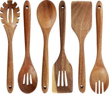 - Material: Acacia Wood Color: Brown Oil finish for a rich color and smooth feel Hand wash and towel dry immediately Hanging hole on handle for storage options Set includes: One turner, one slotted turner, one pasta spoon, one serving spoon, and two slotted spoons Turners- 12.5in length, 3in width, 1in handle thickness, 0.1lb weight Spoons- 12.5in length, 2.6in width, 1in handle, 0.1lb weight