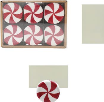 - A delightful set of 6 stoneware place card/photo holders shaped like peppermint candies, featuring festive red and white colors