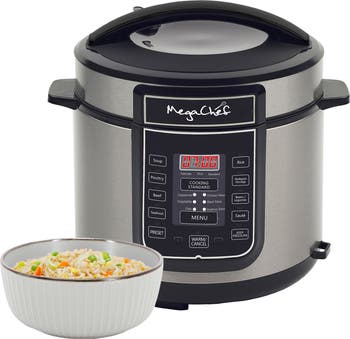 The Megachef 6 Quart Digital Pressure Cooker features many different preset functions to take the guesswork out of cooking times. Cooking under pressure allows you to cut the cooking time up to 70%! Bring the Megachef Pressure Cooker home today and effortlessly prepare delicious flavorful meals for your family and guests!Megachef 6 Quart Digital Pressure Cooker with Pre-set Multiple Function FeaturesReduced Cooking Time up to 70%Easy Pre-Programmed Cooking SelectionsHigh and Low Pressure Cooking OptionsStainless-Steel Cooking Pot for Healthier FoodEffortless Meal PreparationAutomatic ShutoffKeep Warm OptionNon "PTFE"Pressure Limiting, Valve-allows for steam to escape during cooking, stabilizes the pressure inside the cooker.High Grade Stainless Steel-cooking pot non PTFE.14 Pre-Set Menu Buttons let you cook up to 70% faster than conventional oven on the High Pressure Setting, or slow cook up to 9.5 hours