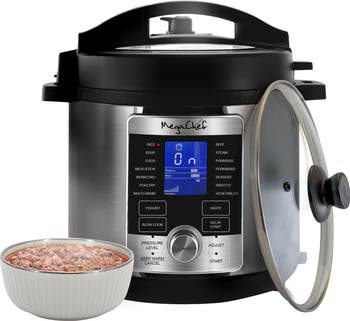 The MegaChef 6 Quart Stainless Steel Electric Digital Pressure Cooker with Lid lets you cook to your heart's content with 14 built in programmable features. The digital display shows cooking time, button indicator lights, and one-touch settings for easily adjusting time, temperature, and pressure. The brushed stainless steel exterior and removable interior allows for easy cleaning and durability. The easy pressure release valve and convenient carry handle includes a locking feature, making it both safe and easy to transfer. Replace your pressure cooker, slow cooker, food steamer, rice cooker, and soup maker with just one electrical appliance!