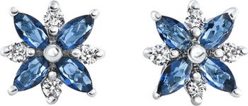 Matching pair of high quality womens earrings features eight marquise cut blue sapphires and eight round cut lab grown diamonds. All stones are prong set in solid 14k white gold earrings with 14k white gold screw back settings.