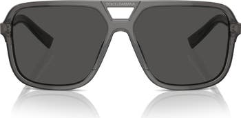The label's typeface logo stamps the temples of Italian-made pilot sunglasses featuring smoky, transparent frames and solid dark-grey lenses.