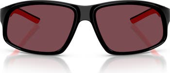These sporty Italian-made sunglasses boast a sleek wrap design with a saddle bridge and a signature Ferrari logo at the temples.