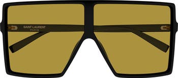 A striking flat-top profile and tinted lenses bring distinct elements to bold sunglasses featuring signature logo lettering along the temples.