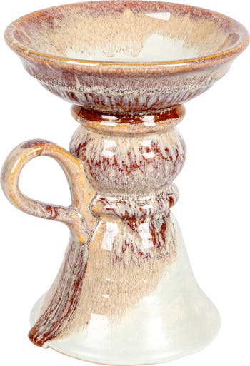 - Elevate any candle display with this stunning stoneware pillar holder with a reactive glaze finish in a rich brown hue that adds depth and character to the holder's surface and a convenient handle perfect for a 5-inch pillar candle