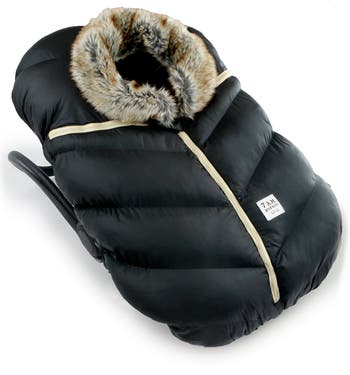 Toss all the blankets and instead envelope your baby in this cozy wind-beating cocoon wrap lined in plush fleece and trimmed in faux fur.