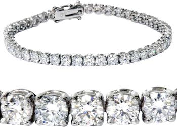 Women's bracelet features round cut lab grown diamonds set in solid 14k white gold. The bracelet measures 7" and features a double lock security.