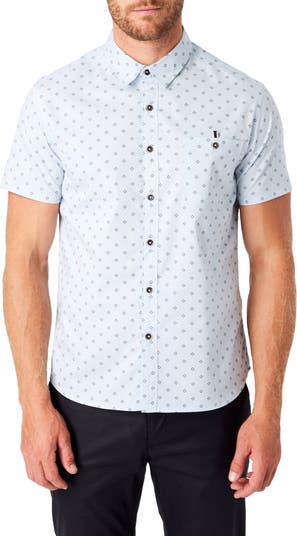 Tiny diamond medallions neatly pattern a short-sleeve button-up tailored from cotton pinpoint with a pop of striped webbing in the chest pocket.