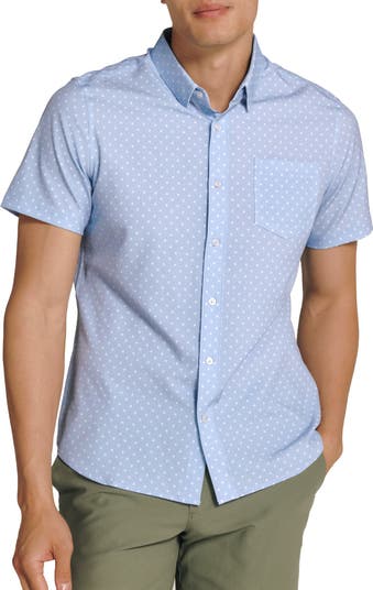 Stretchy, sweat-wicking fabric keeps you going day and night in a floral-dot-print shirt that resists wrinkles to stay crisp and sharp, even when you travel.