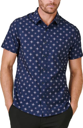 Stretchy, moisture-wicking fabric keeps you going day and night in a brightly patterned shirt that resists wrinkles to stay crisp and sharp even when you travel.