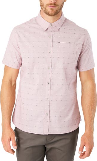 Made slim but with stretch, a casual and breezy sport shirt offers retro-modern flair with its small-scale pattern of colorful squares and dashes.
