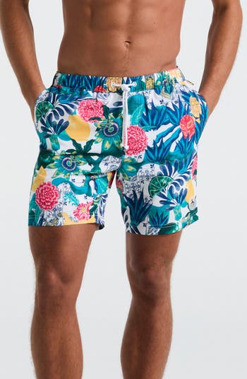A colorful print will have you feeling ready for a vacation in these slim-fit swim trunks. They dry quickly and have plenty of stretch for added confidence in the water and on land.