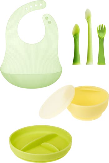 This set is designed to make every mealtime a delightful and tidy experience. This essential feeding set features a soft, adjustable bib that keeps your little one comfortable and clean as they explore new tastes. Accompanied by child-friendly utensils, including a spoon and fork perfectly sized for tiny hands, this set encourages your child to discover the joys of eating independently. The versatile bowl with a lid is perfect for convenient meal prep or storage, and the divided plate promotes variety and healthy portion control. Made from baby-safe silicone, each piece is gentle on tender gums and hassle-free to clean, ideal for both parent-led feeding and self-feeding stages.