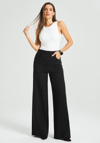 - High-rise fit with a full-length wide-leg silhouette that elongates and balances