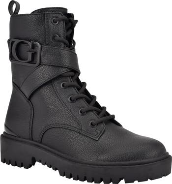 A signature logo buckle marks the shaft of this sturdy combat-style boot lifted on a lugged sole and finished with a side-zip entry.