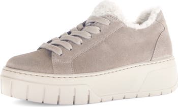 Faux fur enhances the coziness of this lightweight platform sneaker handcrafted in Europe from Italian suede.