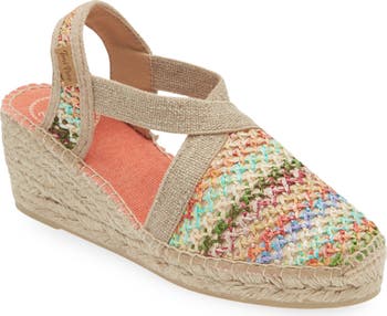 Enchant your stride with this dreamy espadrille-inspired wedge topped with an intricate weave of rainbow threads and grounded on a rubber traction sole.