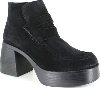 A stacked heel balloons beneath a penny-loafer-inspired platform bootie.